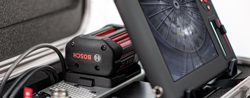 Designed for critical environments such as the chemical industry, the SNK 60x tank camera offers complete freedom from fixed power sources. Thanks to its advanced battery operation, the system runs for up to 5 hours without any external power supply—eliminating the need for extension cables. Use as many batteries as your inspection requires. The widely available 36V Bosch batteries ensure easy replacement worldwide, while the new accessory case conveniently stores two batteries and an external charger for uninterrupted inspection work.